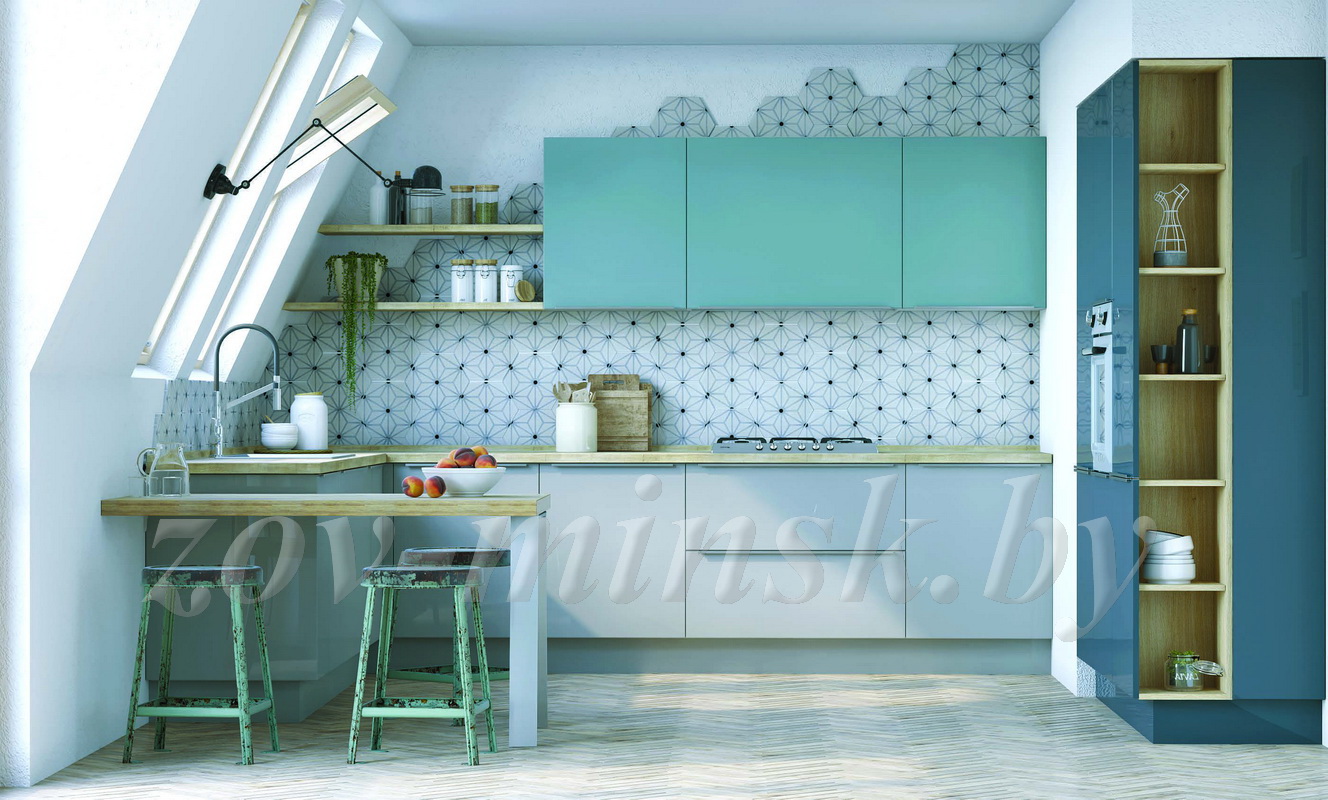 Кухня ЗОВ из крашенного МДФ «Матовый» представлена в комбинации бирюзового и светлого голубого цвета. Кухня достаточно компактная, представленная рядом шкафов и ящиков без ручек. Вместо ручек кухня оснащена современным механизмом пуш-ту-оупен, достаточно лишь нажать на дверку, и она откроется. Гарнитур также оборудован отдельным модулем для встраиваемой техники.