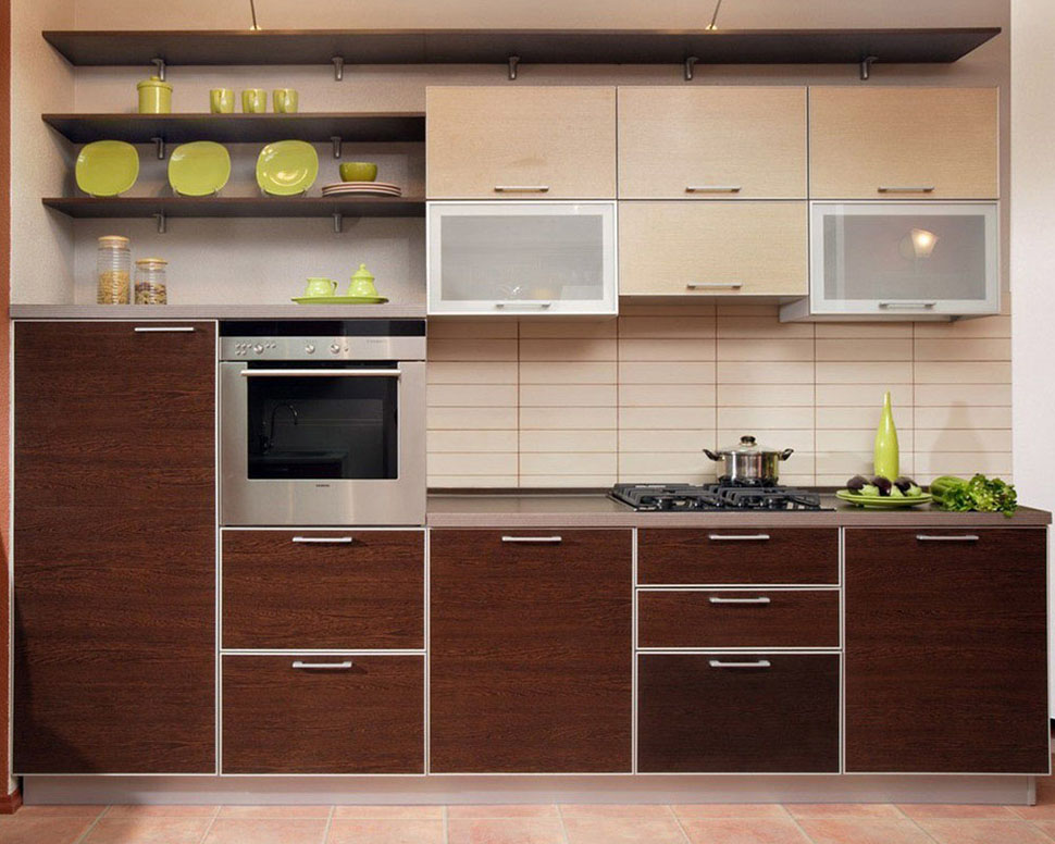 Кухня фабрики ЗОВ из итальянского пластика не только очень практична в использовании, но и красива сама по себе. Сочетание темных древесных и молочных цветов приятно смотрится и гармонично подстраивается практически под любой интерьер.