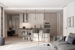 Модульная кухня без ручек с гладкими матовыми фасадами с имитацией шлифованного бетона.