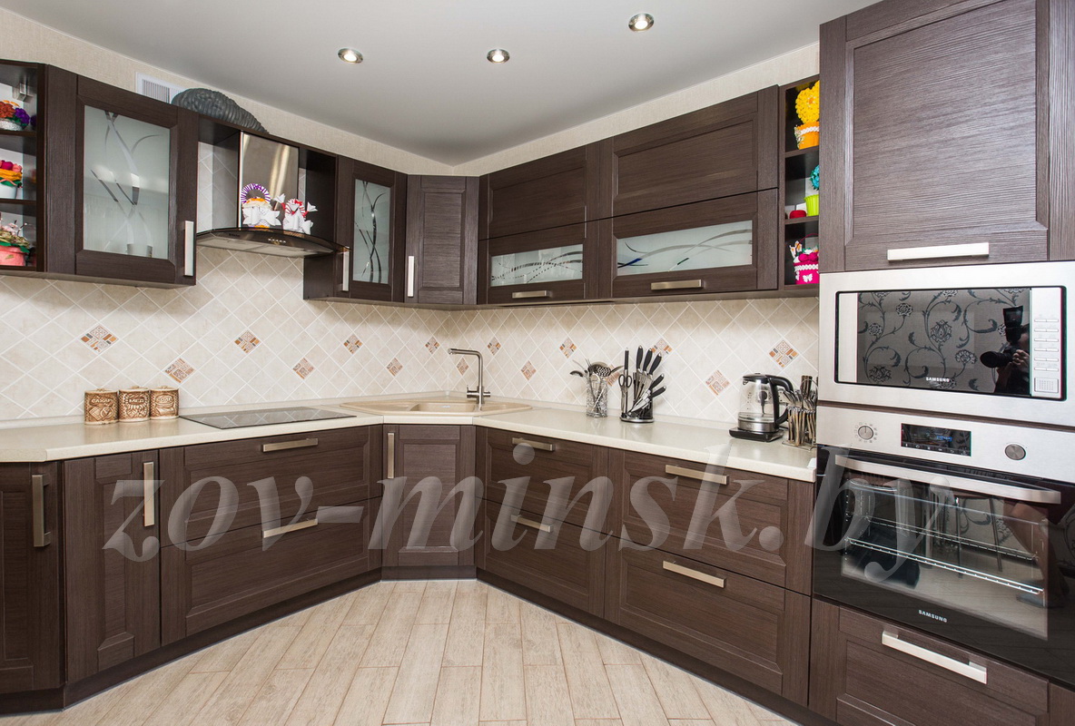 Стильная кухня ЗОВ в темном цвете представляет собой рамочную конструкцию из МДФ, которая облицована древоподобной пленкой ПВХ. Насыщенный темный древесный цвет делает гарнитур очень привлекательным. Некоторые верхние шкафы остеклены и украшены изысканными абстрактными узорами. Кухня оснащена специальным модулем для размещения техники, в частности микроволновки и духового шкафа.