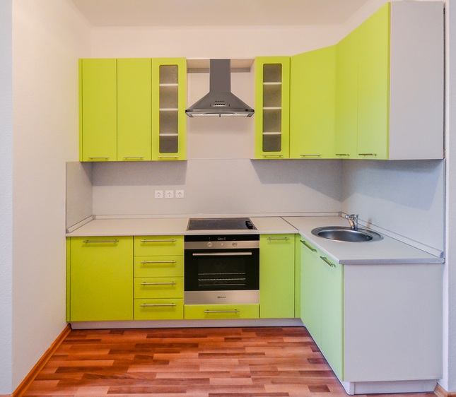 Кухня из недорогой серии «Оптима» оснащена фасадами из высококачественного постформинга. Цвет фасадов (зеленый и лимон глянец) отлично сочетаются со светлой столешницей, выполненной из ударопрочного и влагостойкого материала. Несмотря на свои компактные размеры угловая кухня достаточно функциональна и имеет необходимое количество модулей для создания в помещении комфорта и уюта.