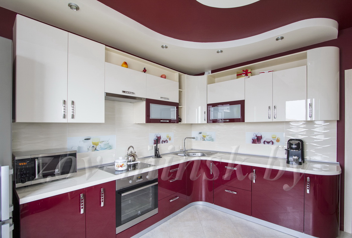 Изысканная угловая кухня ЗОВ с акриловыми фасадами выполнена в комбинированном цвете. Кухонный гарнитур достаточно просторен, поэтому не будет препятствий для кулинарного творчества. Кухня оснащена множеством ящиков и шкафчиков, в которых будет храниться вся кухонная утварь и кухонные принадлежности, а также всевозможные специи и чаи. Фурнитура представлена стильными металлическими ручками с вырезами.