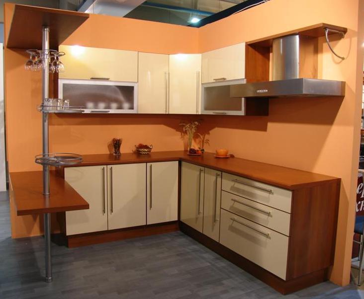 Угловая кухня с фасадами из пластика снабжена удобной барной стойкой с металлической подставкой для бокалов. Светлые фасады кухни сделают помещение визуально шире и добавят нотку свежести в вашу обстановку. Гарнитур с компактными размерами будет превосходно смотреться в небольшой уютной кухне.