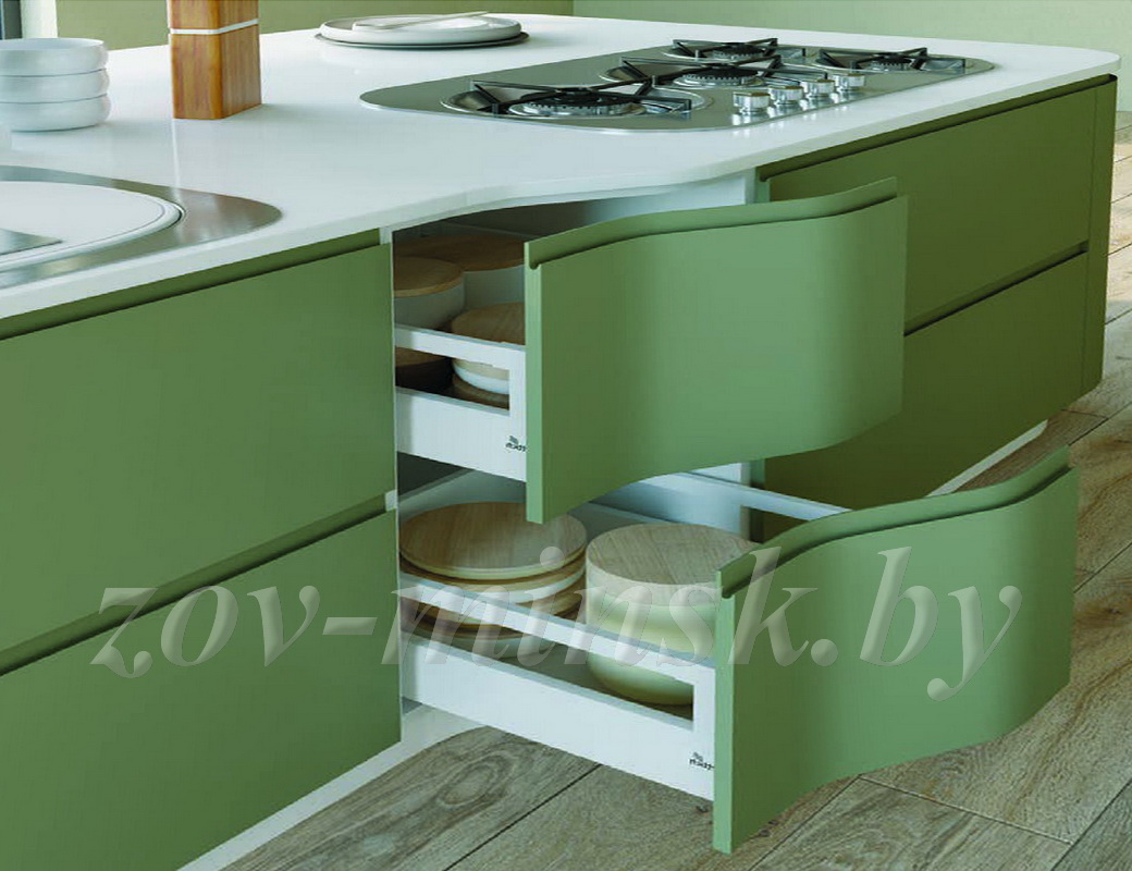 Кухня Зов «Зеленый Интегро» из крашенного МДФ представлена в матовом зеленом цвете. Кухня достаточно просторная, представленный многообразием выдвижных ящиков без ручек. Вместо ручек кухня оснащена современным механизмом пуш-ту-оупен, достаточно лишь нажать на дверку, и она откроется. Также в гарнитуре имеется отделение для варочной панели.