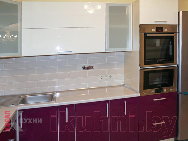 Кухонный гарнитур обладает большими габаритами, что подразумевает высокую функциональность и вместительность. Сочетание бордового и белого глянца выглядит ярко и эффектно. Часть фасадов выполнена из матового стекла лакомат.