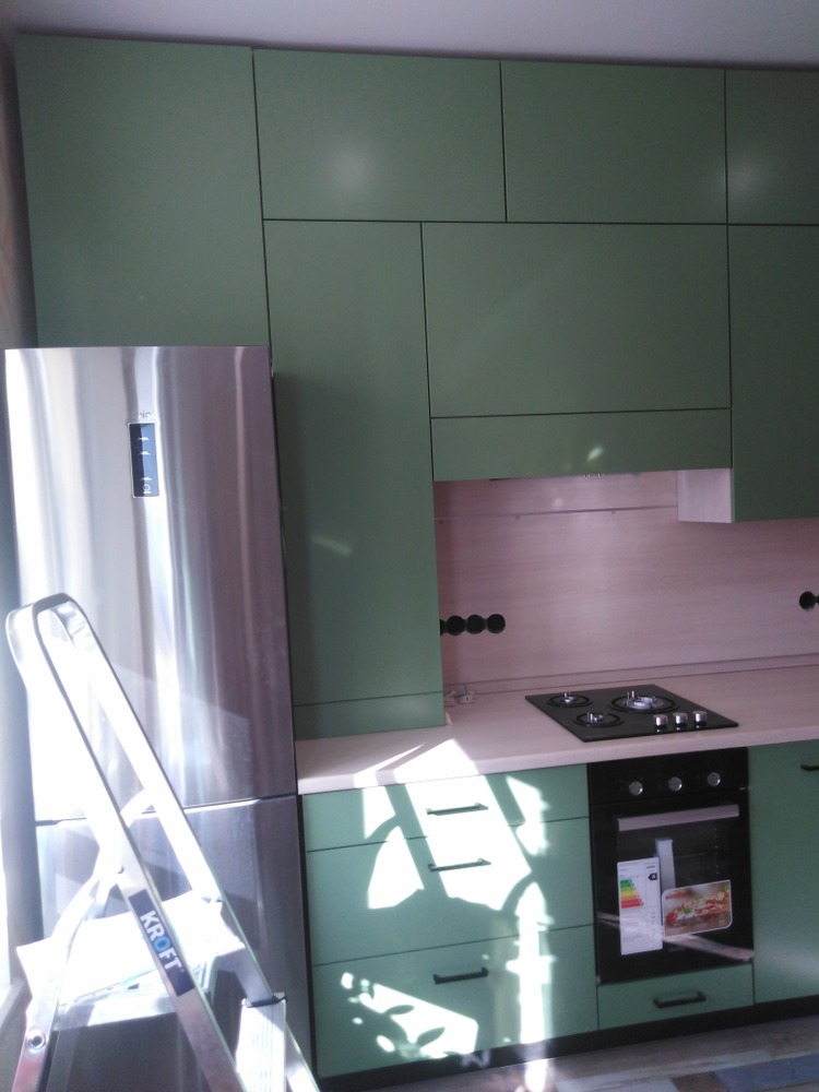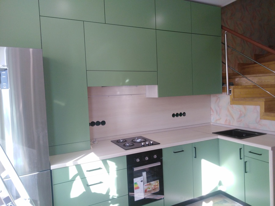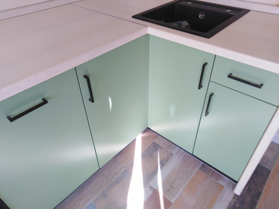 Компактная кухня в двухцветном исполнении. Фасады из ЛДСП.
