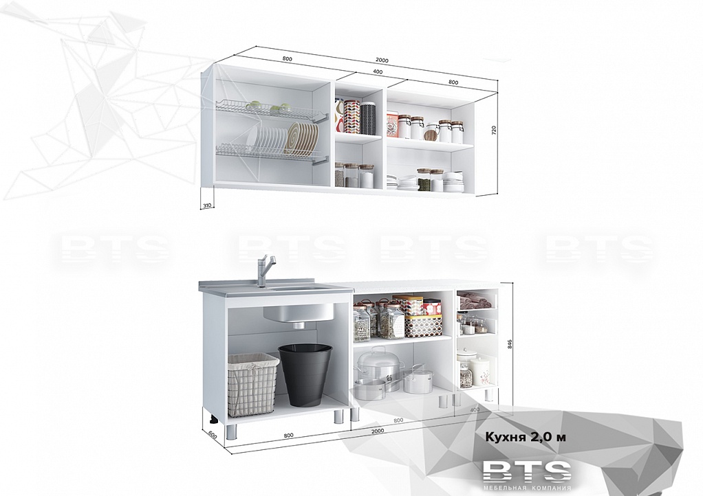 Низ комплекта состоит из мойки (ширина 800 мм), стола с 2 створками (ширина 800мм),стола с 3 ящиками (ширина 400мм) .