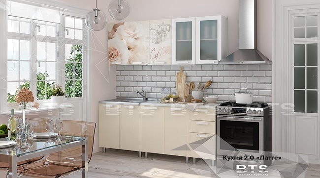 Верхние фасады со стеклом. Ширина кухни 230 см.