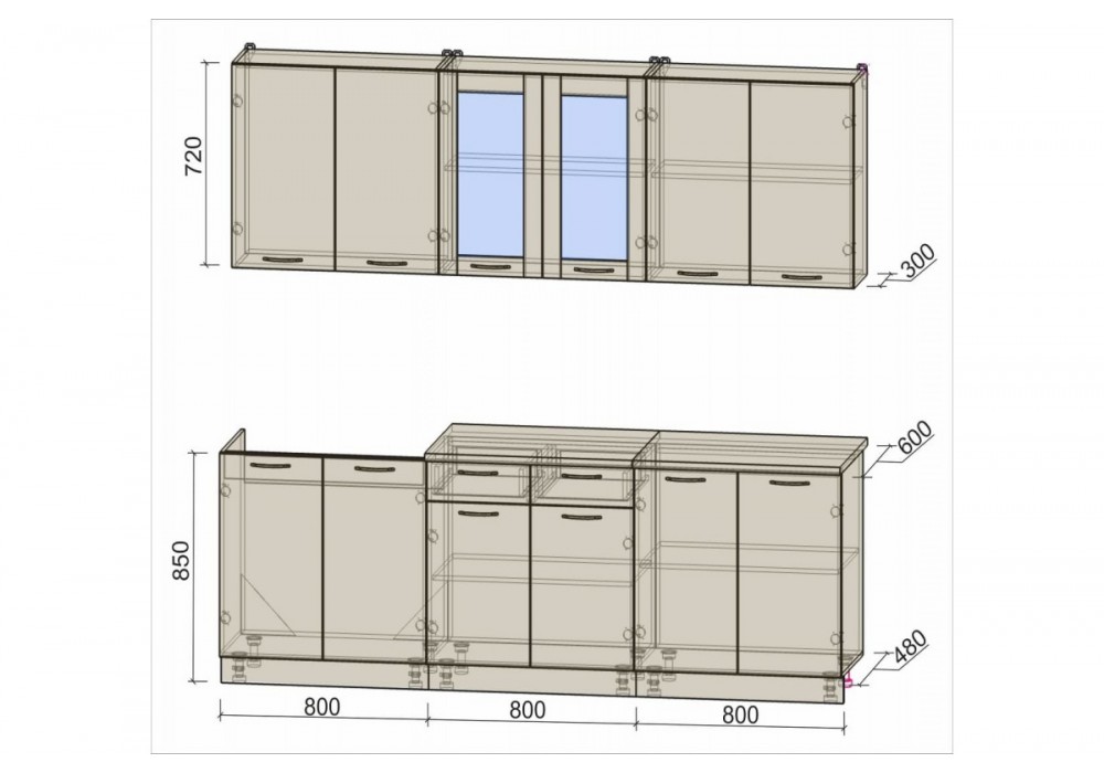 - Глубина напольных шкафов без столешницы: 480 мм.