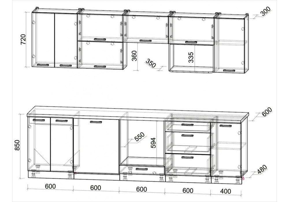 Материал фасада и корпуса: ЛДСП 16 мм. Ширина кухни 230 см.