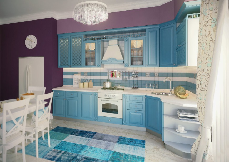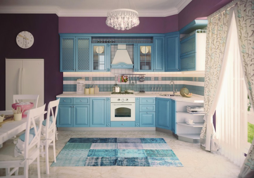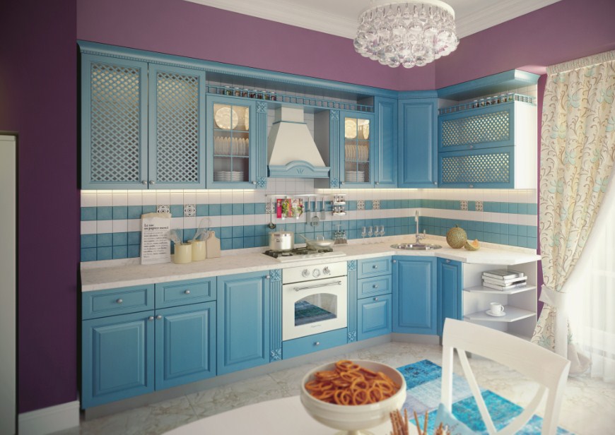 Верхняя линия шкафчиков с стеклянными вставками и открытыми полками.