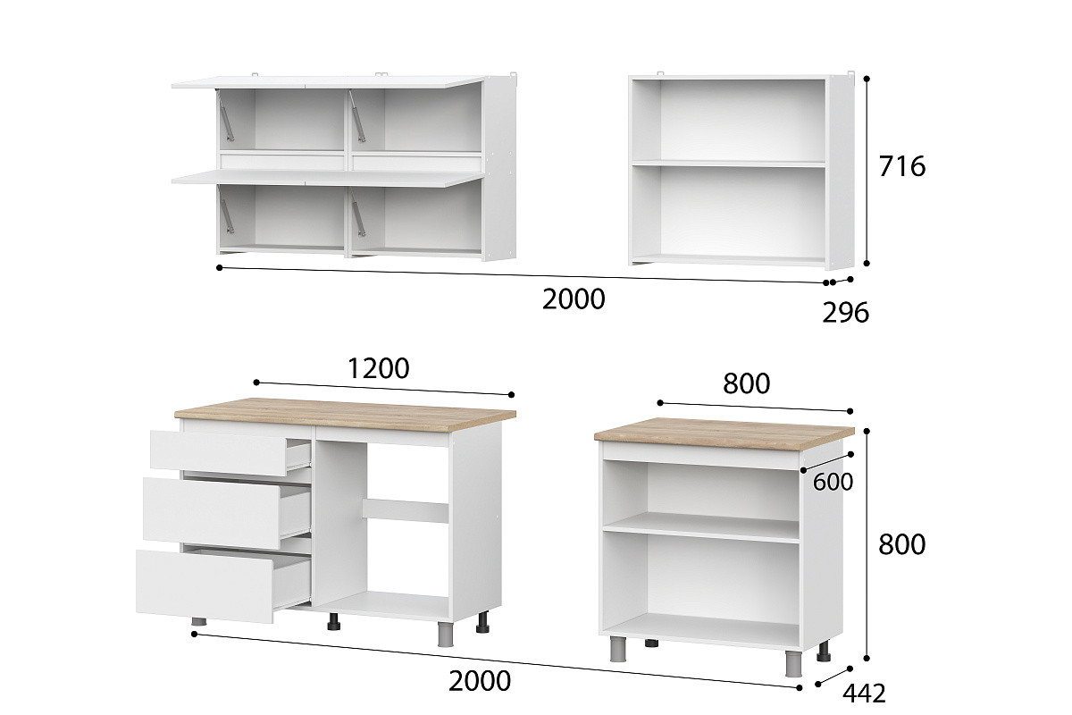 - Габариты модулей низ (ШхВхГ) - 2000х820х442 мм (без столешницы)/1200х846х600 мм (со столешницей).