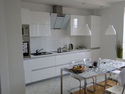 Линейная глянцевая кухня изготовлена из высококачественного МДФ и окрашена в белый цвет. Представленная модель оборудована нишами для встраиваемой бытовой техники.