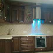 Угловая классическая кухня в древесном цвете. Материал фасадов МДФ не прихотлив в уходе.