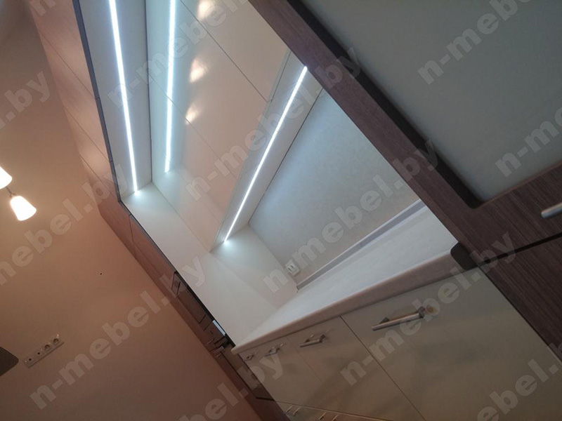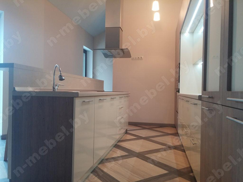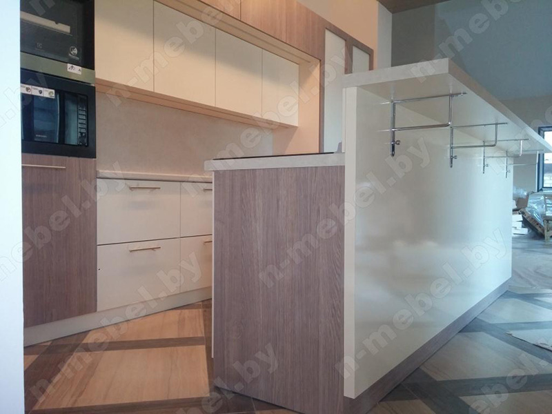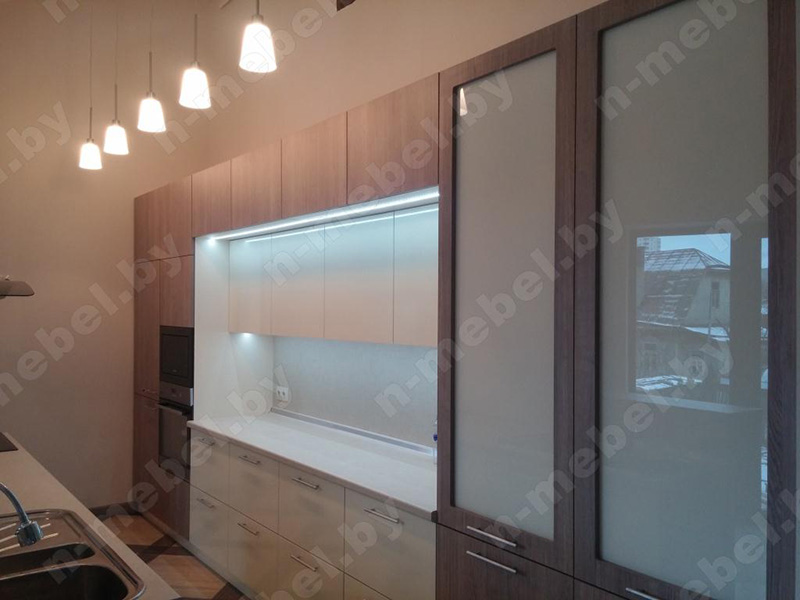 Линейная кухня с современным дизайном изготовлена из прочных качественных материалов. В составе гарнитура имеется большой шкаф со вставками лакобель, в котором можно хранить посуду. Одним из преимуществ кухни является наличие острова, который с одной стороны наполнен шкафами, а с другой может играть роль барной стойки.