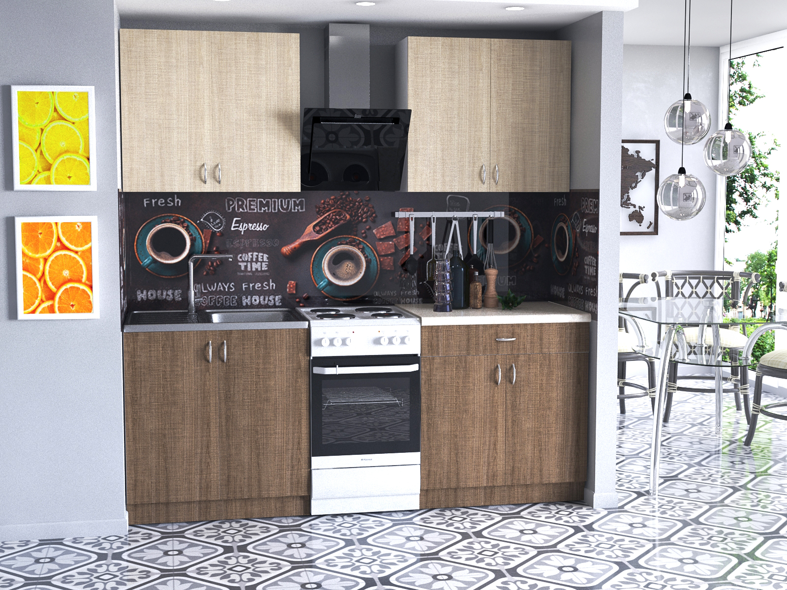 Современная кухня эконом-класса представлена в комбинированном цвете фасадов. Скинь выполнена в стиле кофейни, которая отлично соответствует цветовой гамме кухни. Вместительные шкафчики позволят хранить в них всю необходимую кухонную утварь.