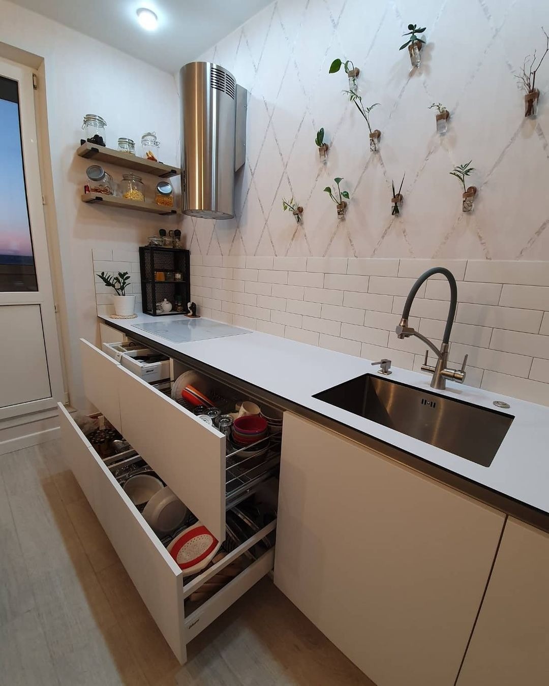 Компактный гарнитур. Внутри 3 выдвижных ящика, двухуровневая сушка, полки.