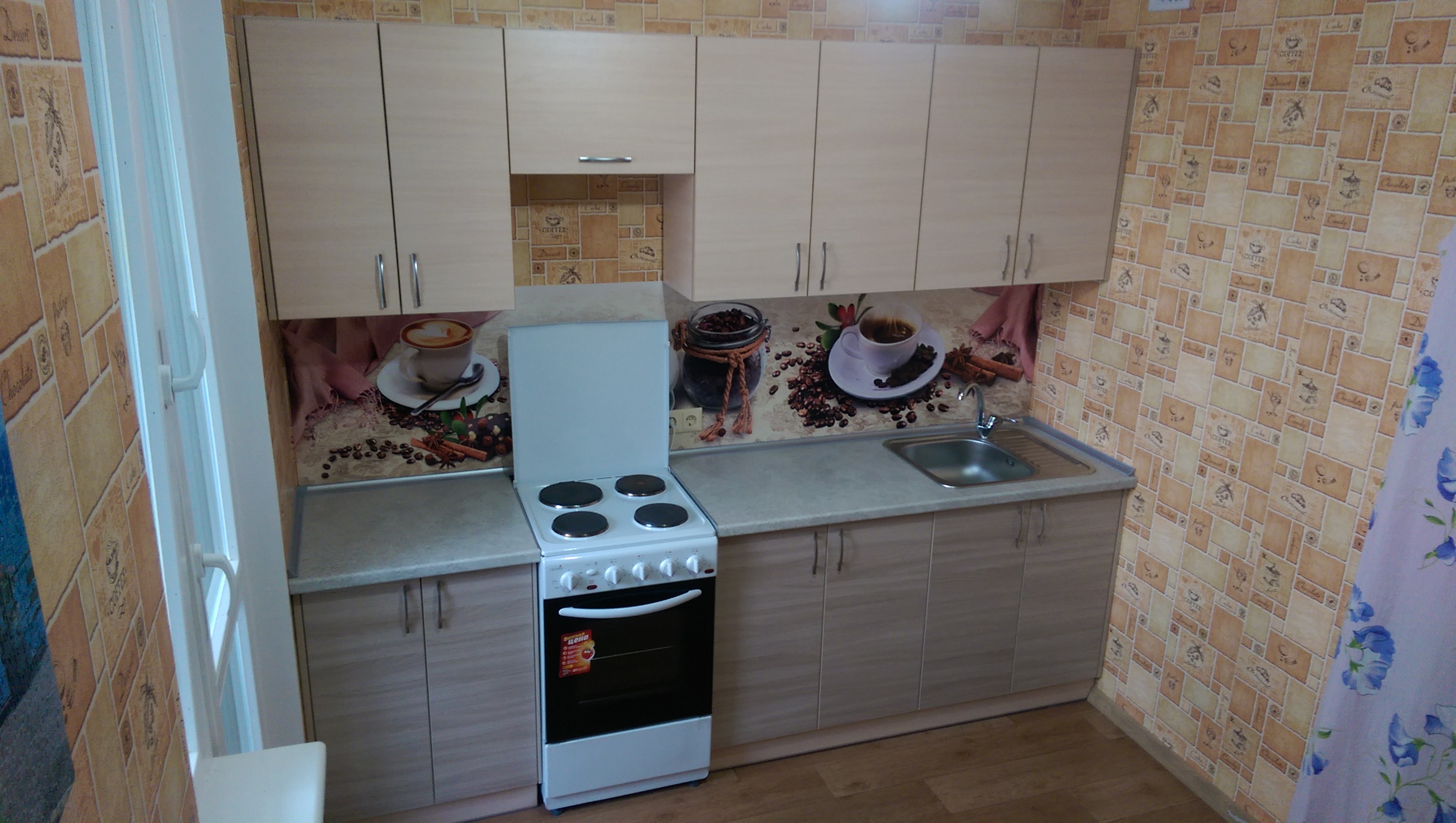 Стандартный линейный гарнитур ламинирован в тонах темного и светлого ясеня. Столешница серого цвета.