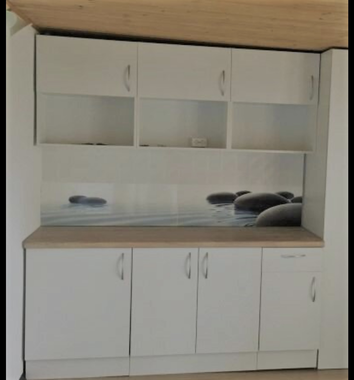 Верхние фасады со стеклом. Ширина кухни 110 см.