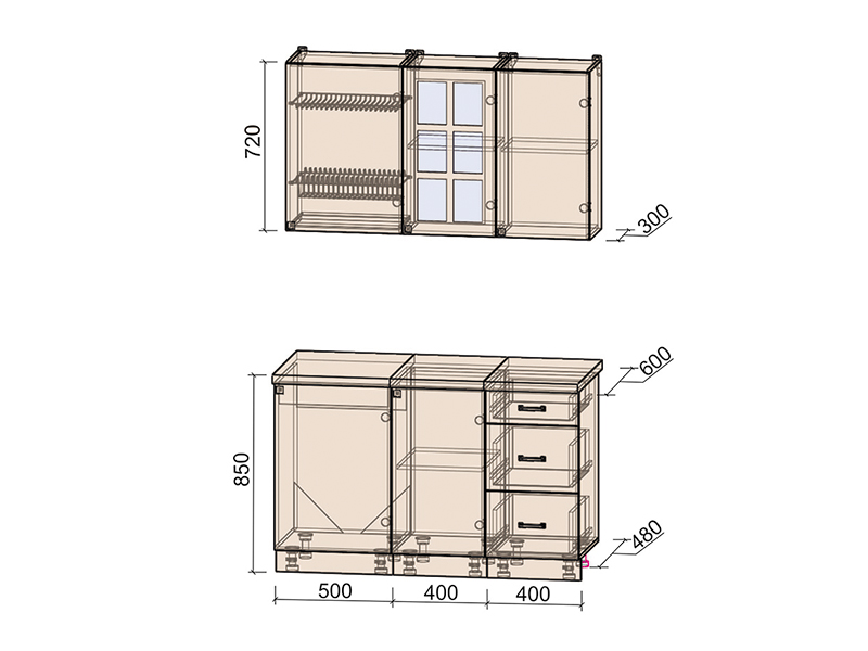 Фурнитура: дверные петли с доводчиками, шариковые направляющие, мебельная опора, кухонные навесы, ручка "Ionika" кнопка, ручка "Ionika" дуга, сушка для посуды.