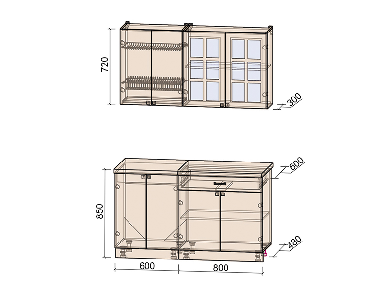 Фурнитура: дверные петли с доводчиками, шариковые направляющие, мебельная опора, кухонные навесы, ручка "Ionika" кнопка, ручка "Ionika" дуга, сушка для посуды.