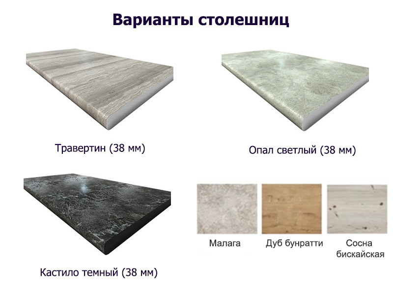 Цвет столешницы на фото: "кастило темный". Иные доступные цвета столешниц для данной модели кухни: "травертин", "опал светлый", "малага", "дуб бунратти", "сосна бискайская" (см. фото 4 в галерее).