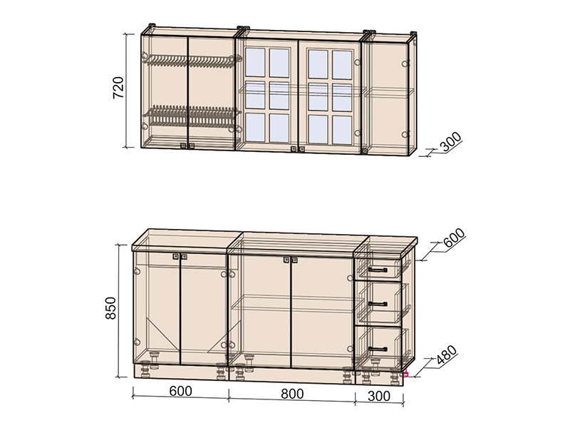 Фурнитура: дверные петли с доводчиками, шариковые направляющие, мебельная опора, кухонные навесы, ручка "Ionika" кнопка, ручка "Ionika" дуга, сушка для посуды.
