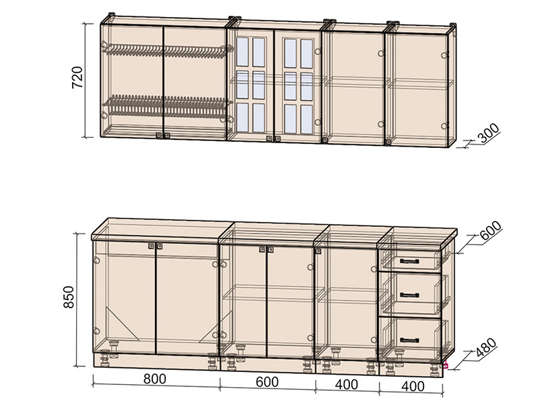Фурнитура: дверные петли с доводчиками, шариковые направляющие, мебельная опора, кухонные навесы, ручка "Ionika" кнопка, ручка "Ionika" дуга, сушка для посуды.