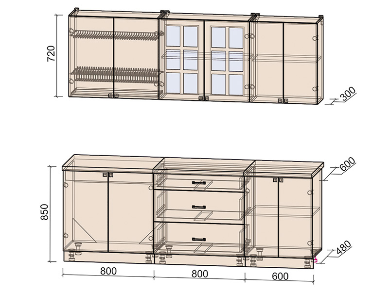 Фурнитура: дверные петли с доводчиками, шариковые направляющие, мебельная опора, кухонные навесы, ручка "Ionika" кнопка, ручка "Ionika" дуга, сушка для посуды.