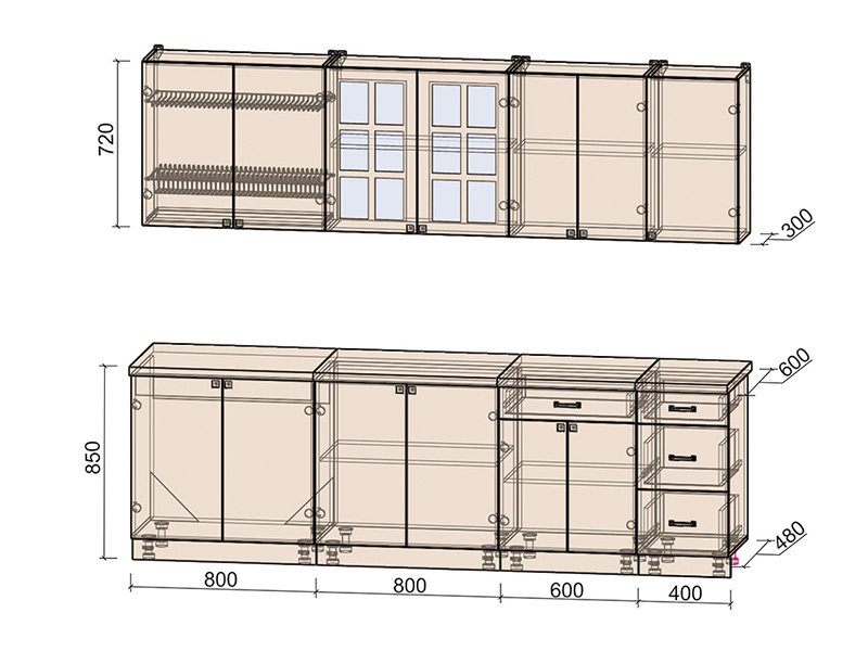 Фурнитура: дверные петли с доводчиками, шариковые направляющие, мебельная опора, кухонные навесы, ручка "Ionika" кнопка, ручка "Ionika" дуга, сушка для посуды.