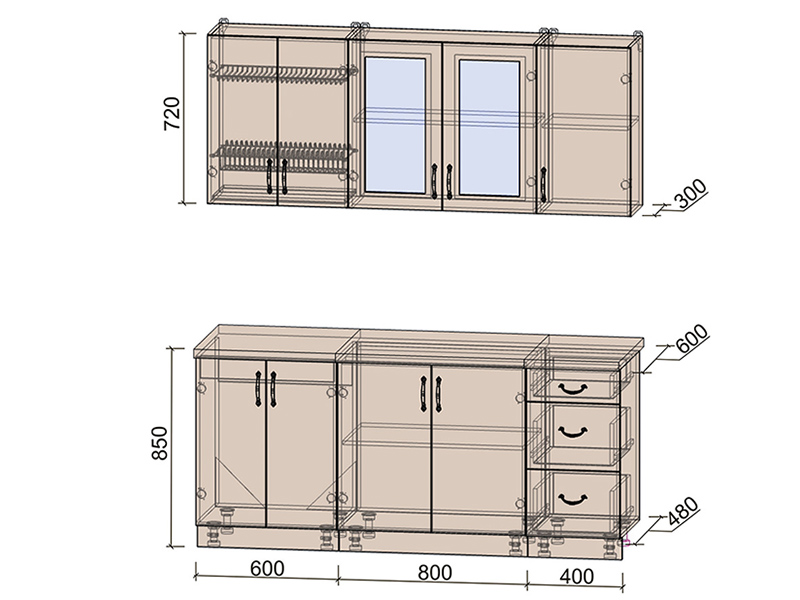 Фурнитура: дверные петли с доводчиками, шариковые направляющие, мебельная опора, кухонные навесы, ручка "Апрель", ручка "Верона", сушка для посуды.