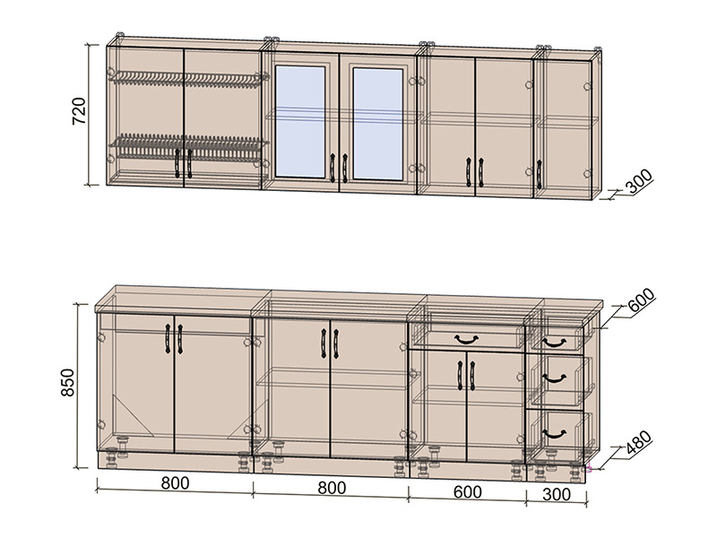 Глубина по корпусу: верхний ряд – 30 см, нижний ряд – 48 см.