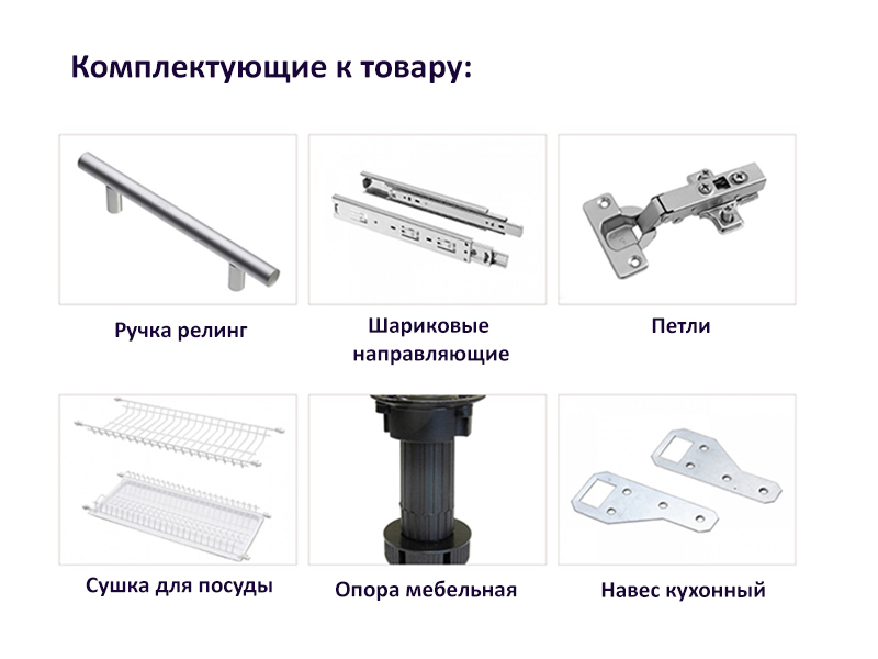 Фурнитура: петли, шариковые направляющие, мебельная опора, кухонные навесы, ручки-рейлинги, сушка для посуды.