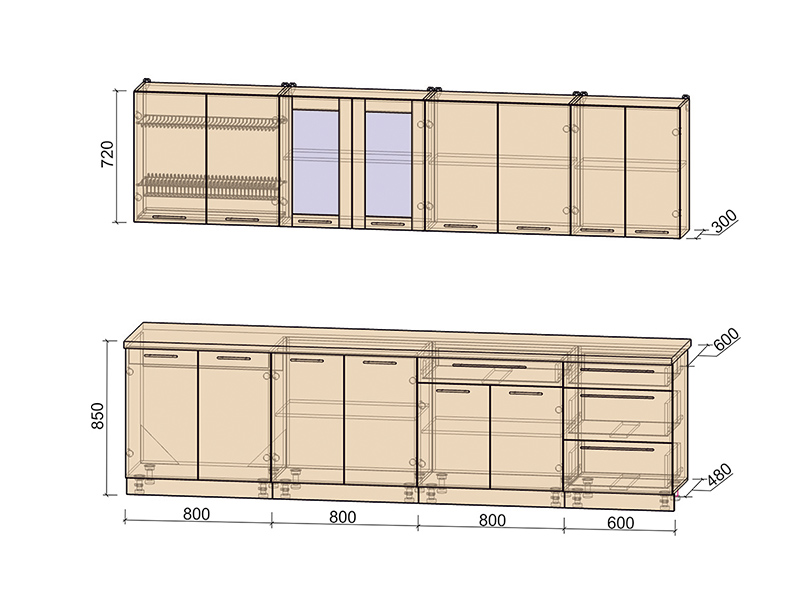 Навесной шкаф оснащен двухуровневой сушкой для посуды.