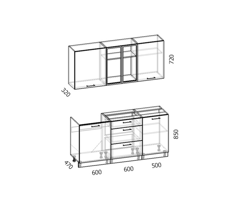 Наполнение: шкаф под накладную мойку 60 см, 3 выдвижных ящика, шкаф под сушку, витрина с закрытыми полками.