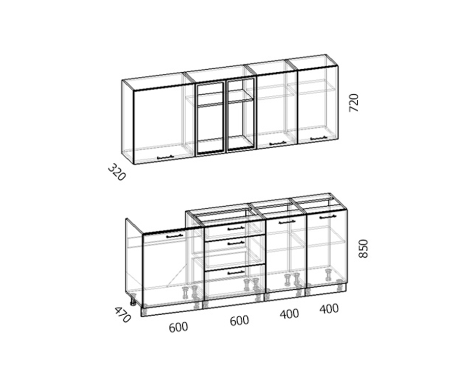 Наполнение: шкаф под накладную мойку 60 см, 3 выдвижных ящика, шкаф под сушку, витрина с закрытыми полками.