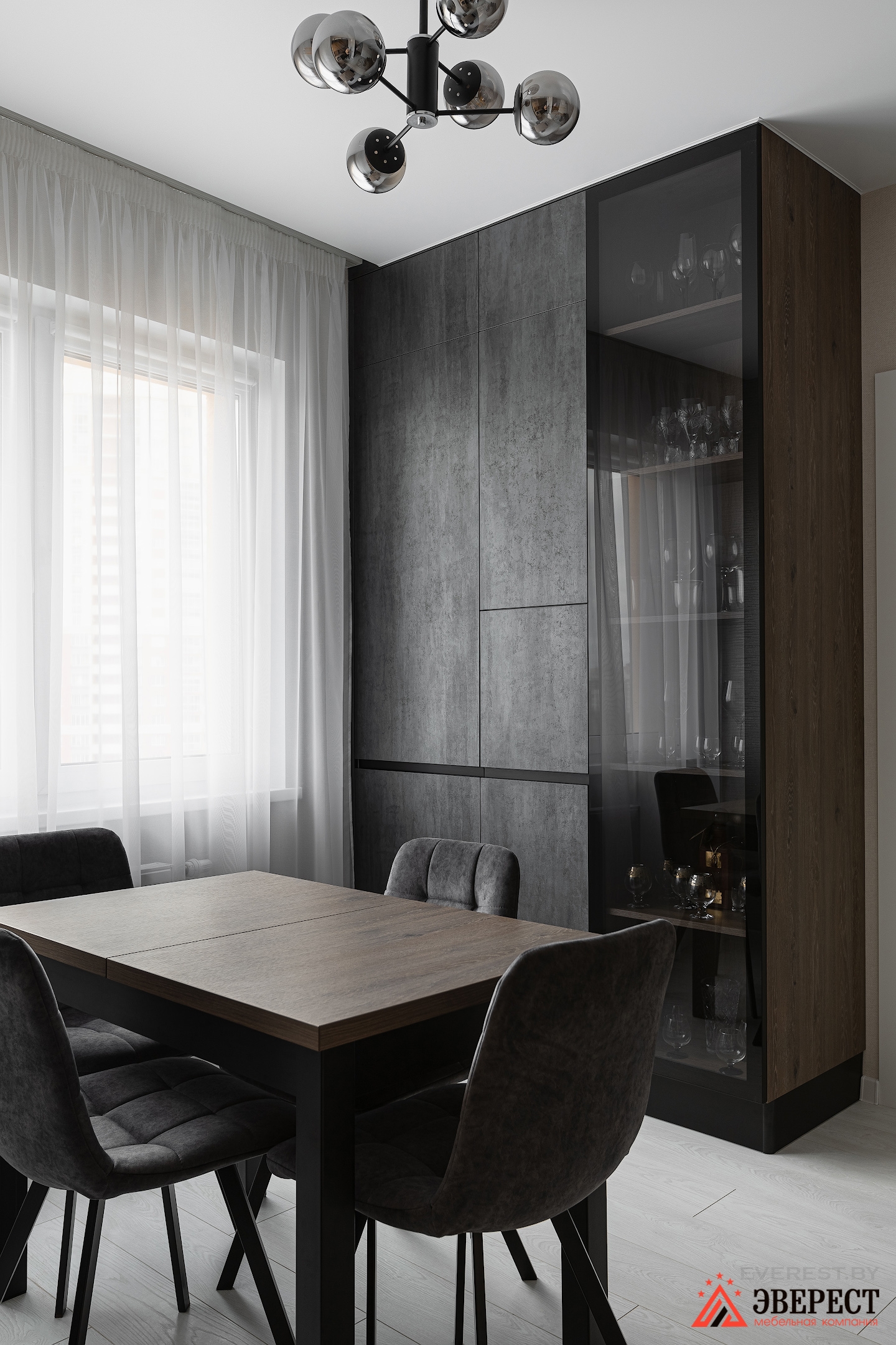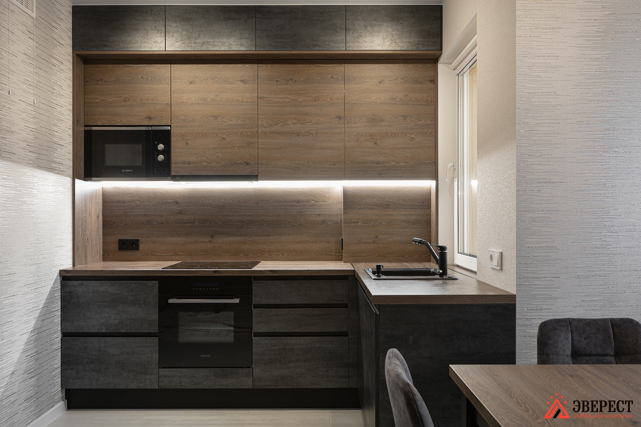 Практичный и надежный гарнитур в сочетании темного и светлого цветов фасада.