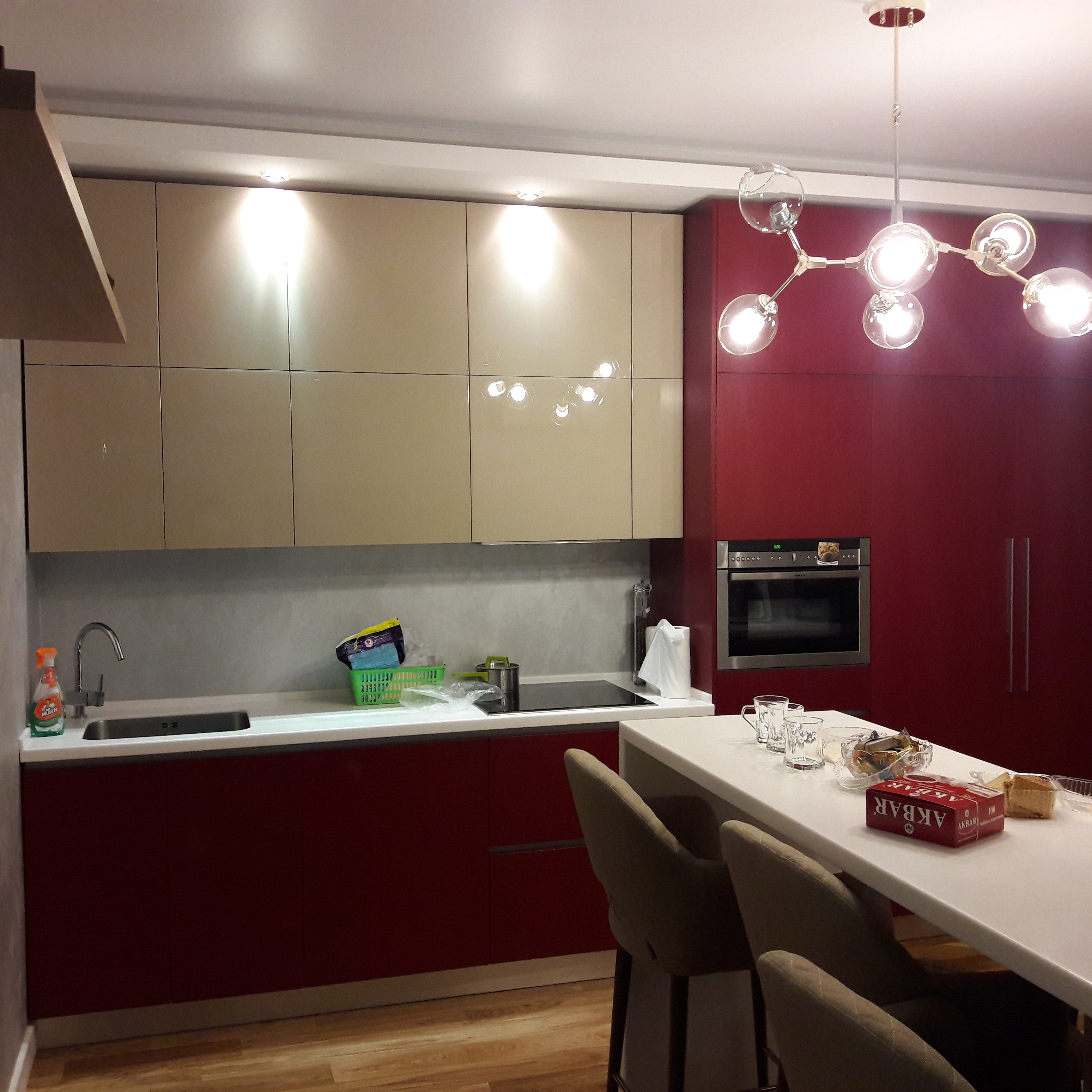 код 110529Ниши для встраиваемой техники, фасады без ручек, продуманная система хранения.