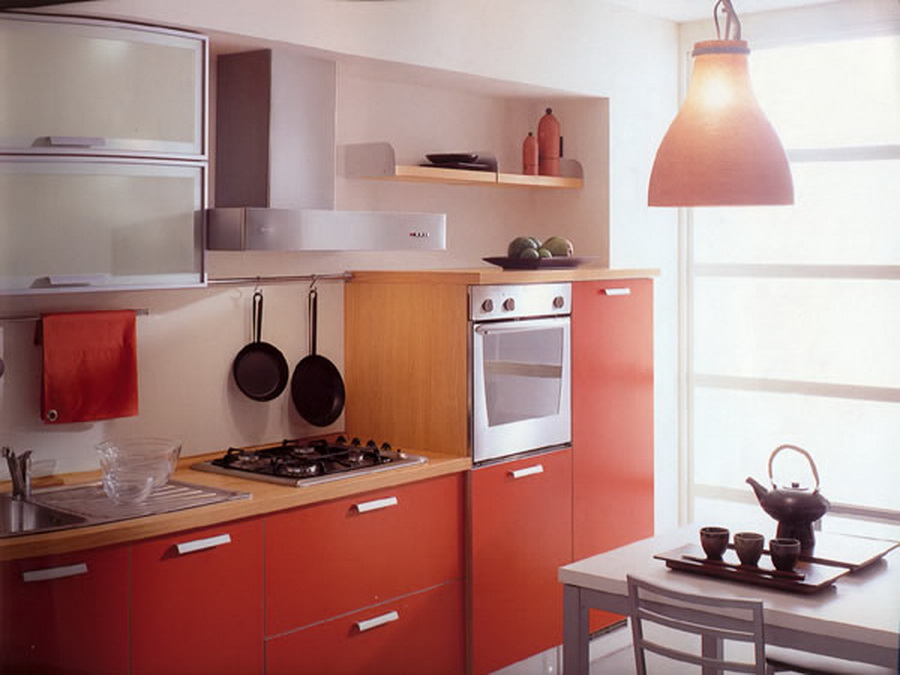 Красный цвет фасада придает гарнитуру современный и уникальный вид. Конструкция имеет нишу для размещения духового шкафа. Кухню удачно дополняет столешница цвета светлого дерева.