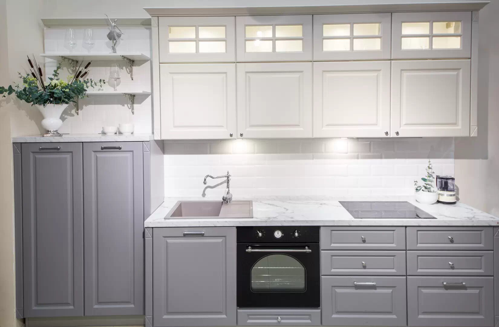 Линейная кухня с фасадами из МДФ и стеклянными вставками