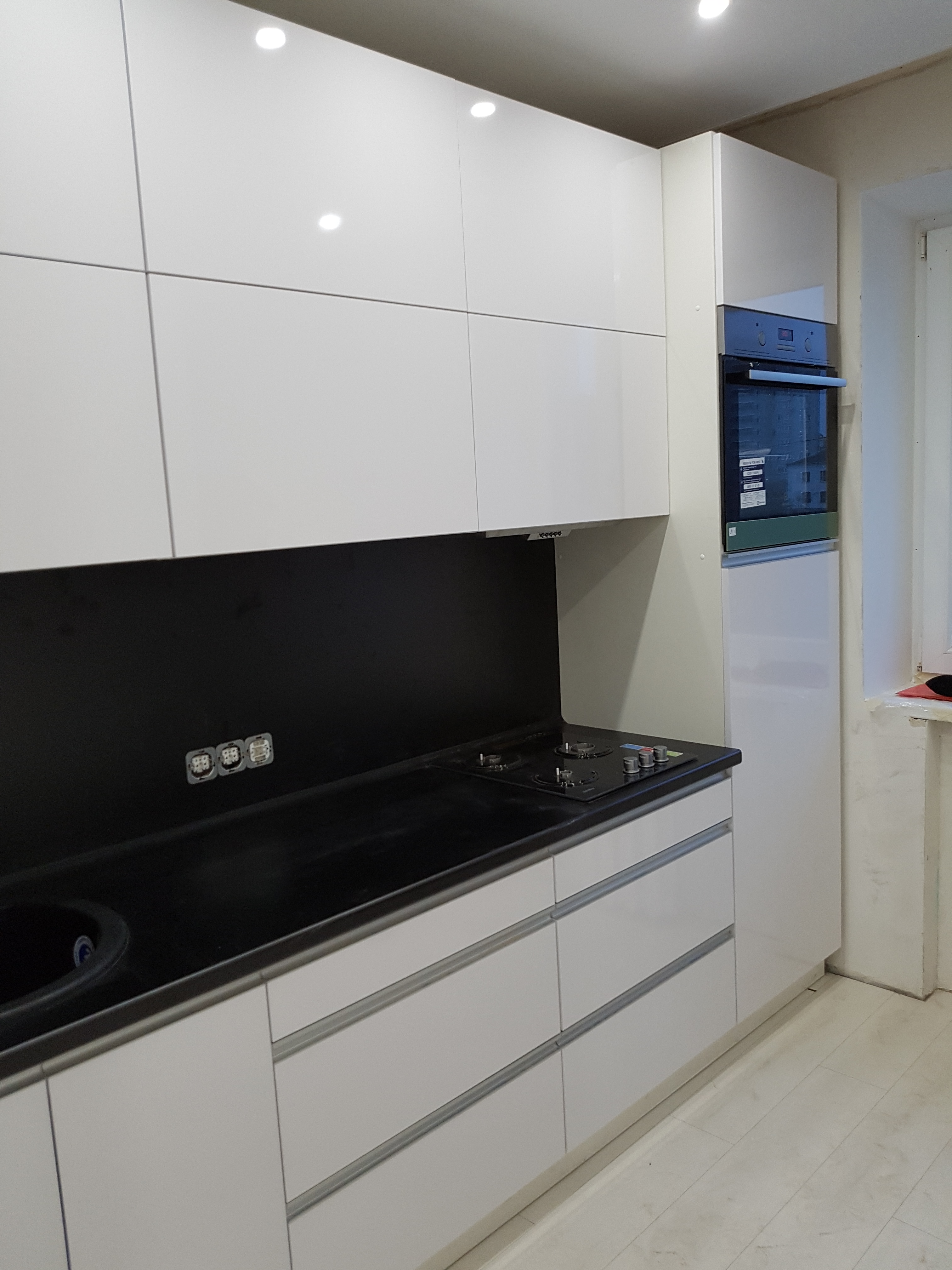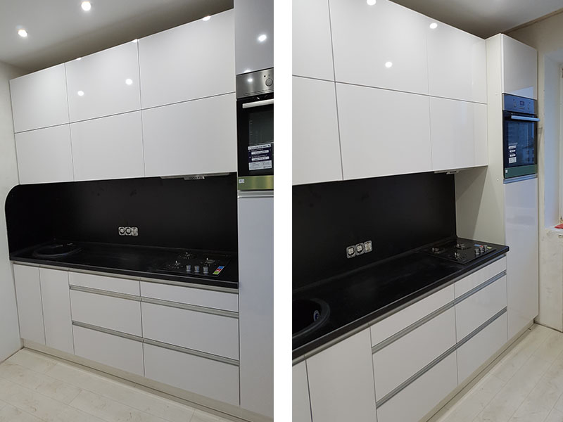 Фасады кухонного гарнитура выполнены в белоснежном цвете, а рабочее пространство констрастно выделено черным насыщенным оттенком. Глянцевые фасады и скрытая фурнитура делают модель лаконичной, что позволяет использовать ее со многими современными стилями интерьера.