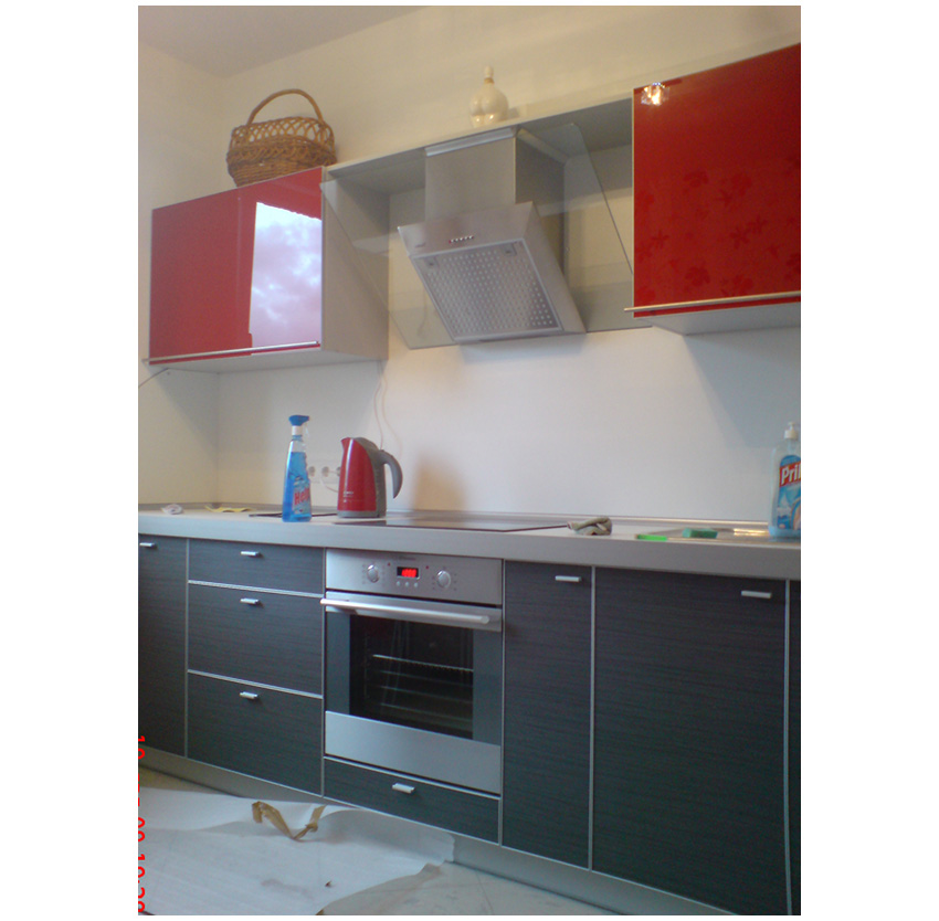 Линейная модель, обладающая компактными размерами, идеально подойдет для уютной малогабаритной кухоньки. Нижние фасады кухни окрашены в темно-серый цвет, а верхние представлены в ярко-красном тоне и оснащены удлиненными металлическими ручками. В составе кухни предусмотрены также ниши для встраиваемой техники.