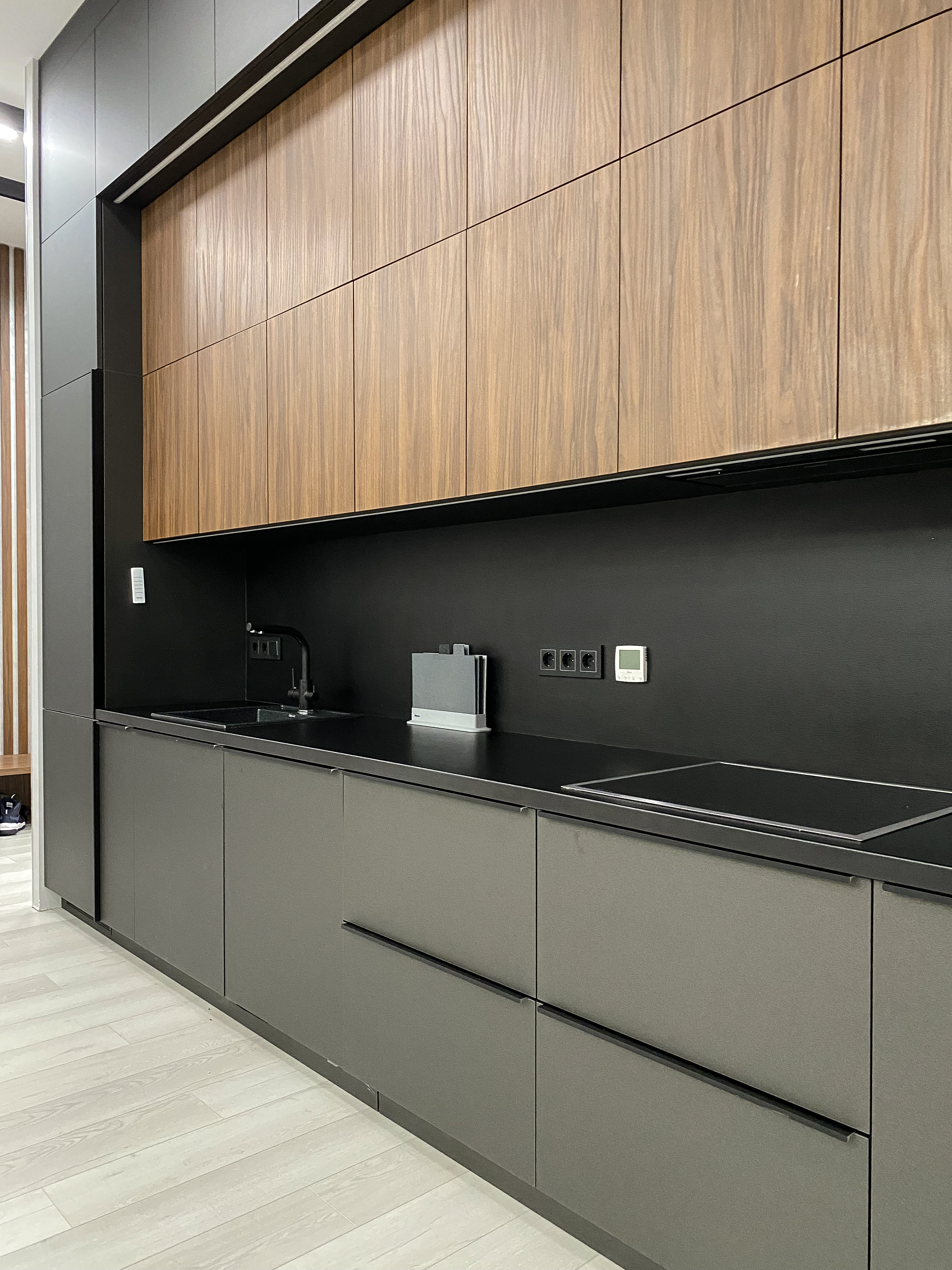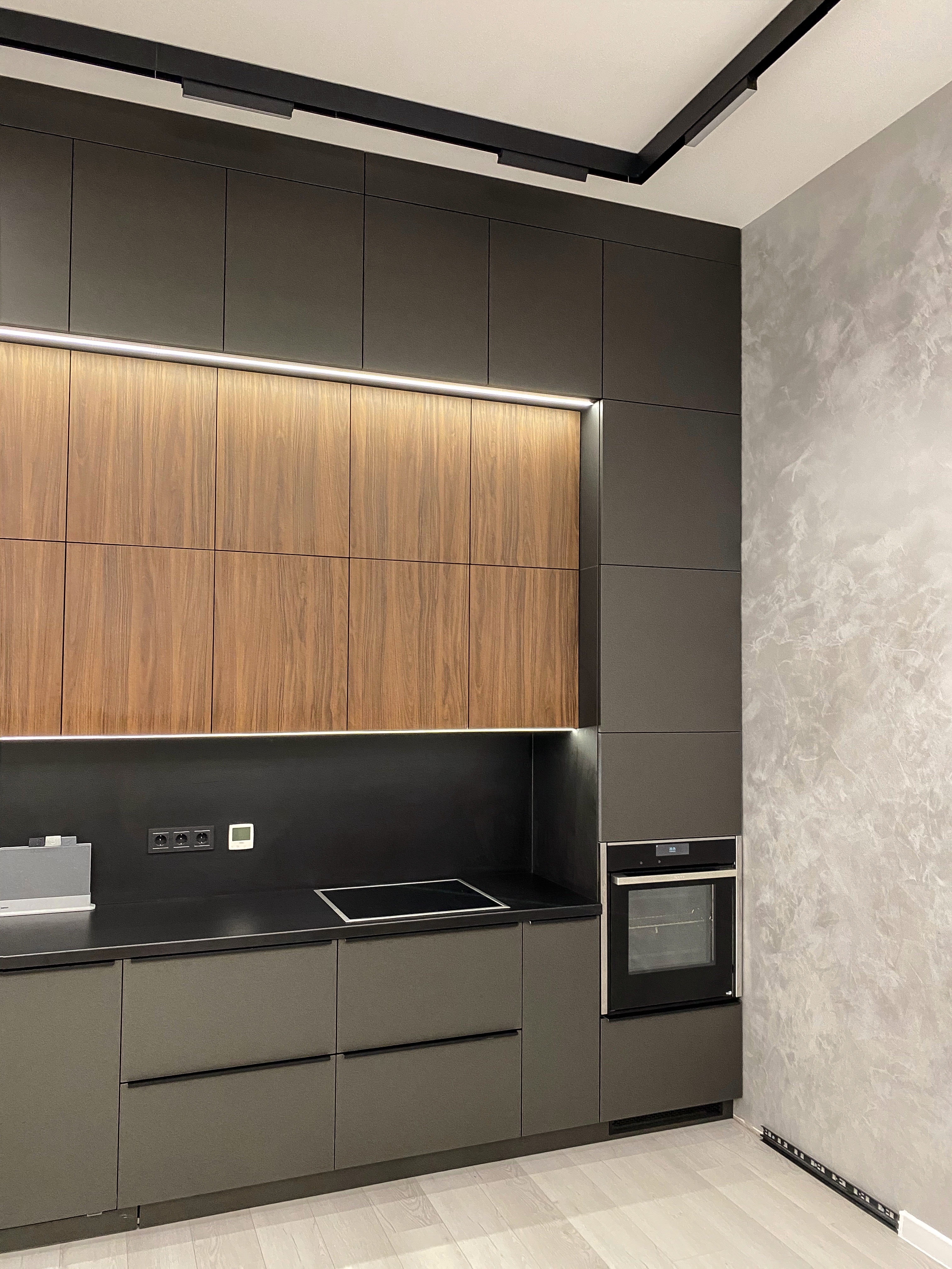 Современная кухня в нише с акцентом на натуральный шпон и глубокий графит. Идеальное решение для интерьера в стиле минимализм или урбан, где важны строгость линий и чёткий ритм. Композиция смотрится как встроенный архитектурный элемент.