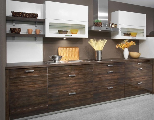 Современная кухня представлена в виде компактной линейной конструкции, оснащенной множеством открытых и закрытых полок и шкафчиков. Два верхних модуля украшены стеклянными вставками. Открытые полочки могут служить место хранения различных предметом декора или роскошных кухонных принадлежностей.