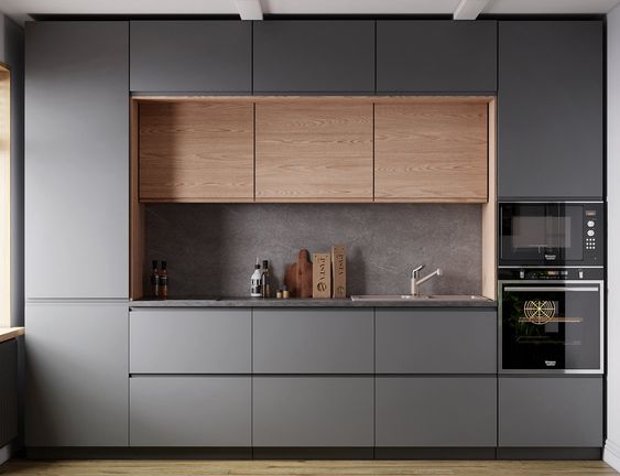 Компактный и вместительный кухонный гарнитур без ручек, матовые фасады, ниши для техники.