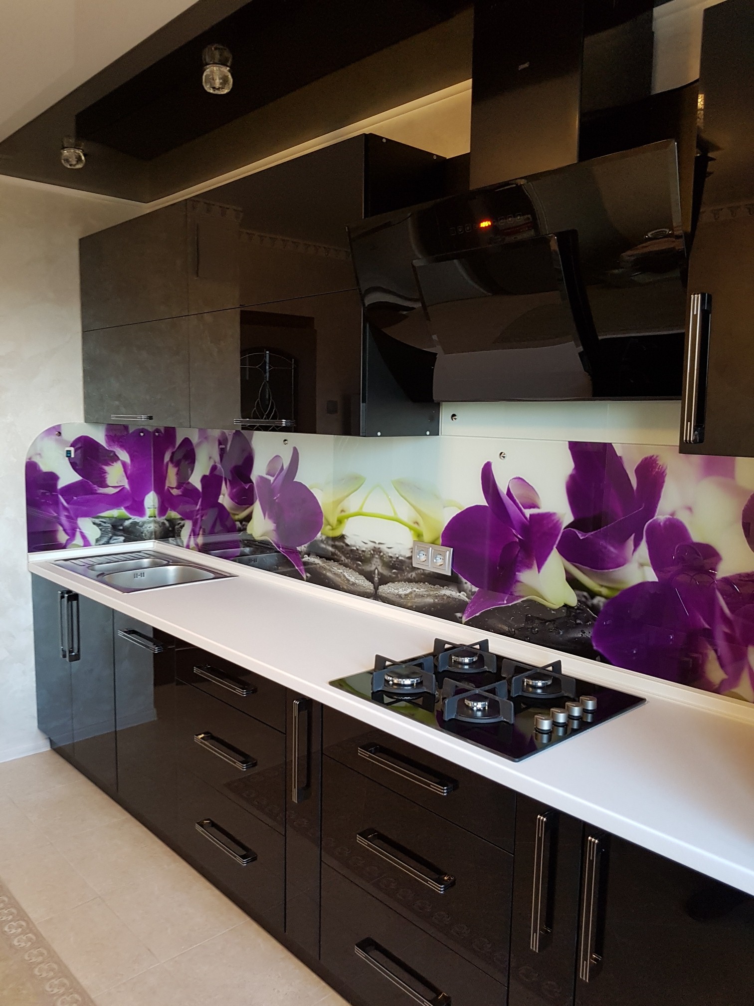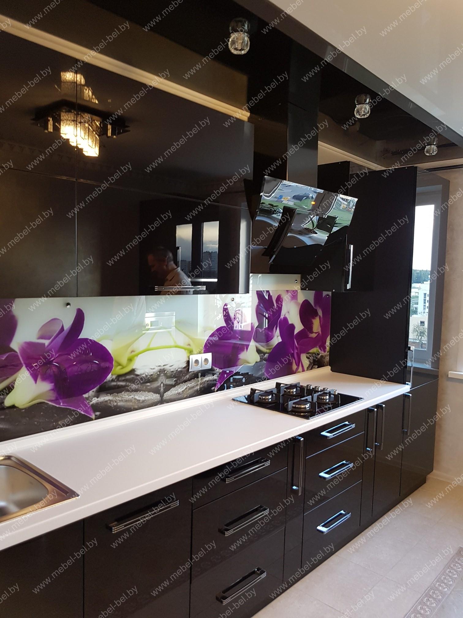 Фасады с фрезеровкой, витражная вставка. Ширина кухни 250 см.