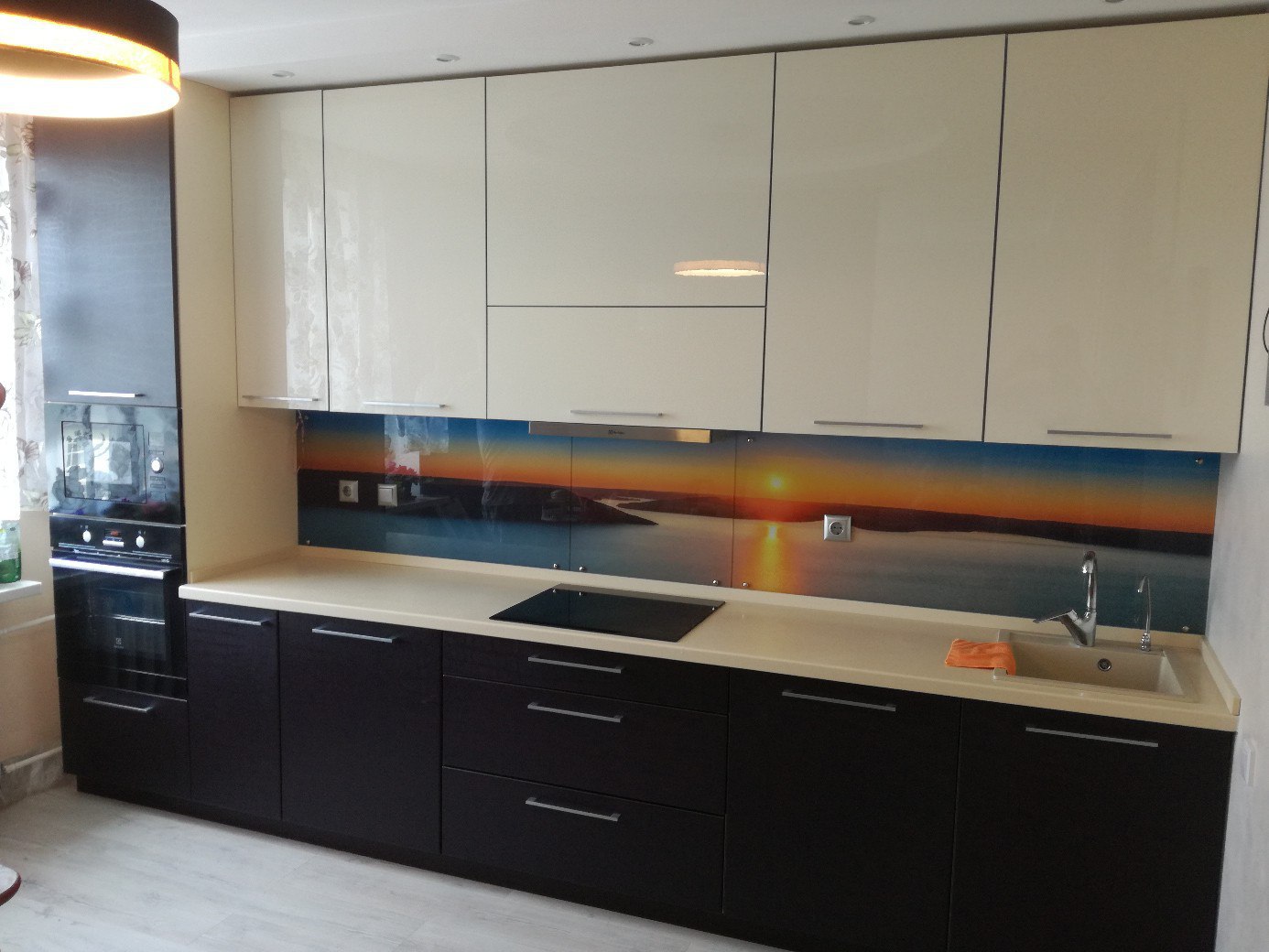 Удобные металлические ручки в цвете «сатин». Ширина кухни 220 см.