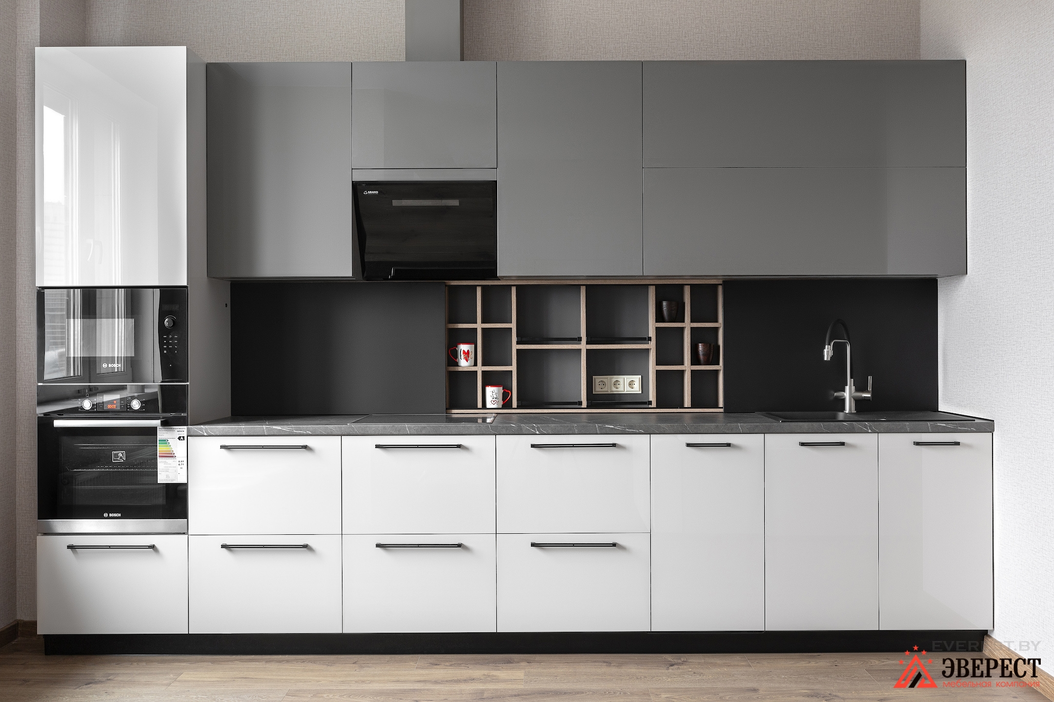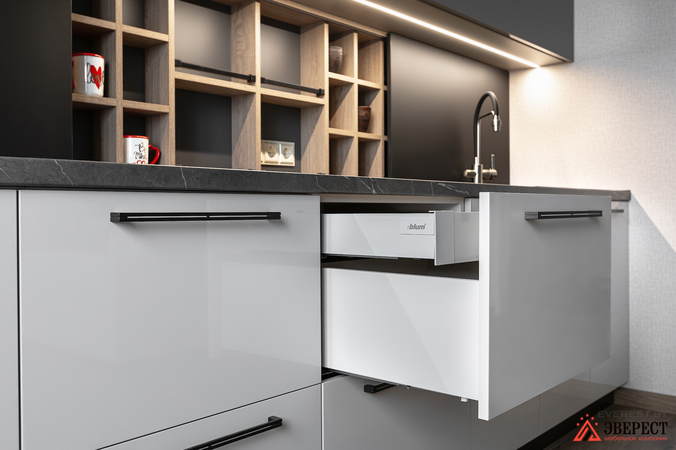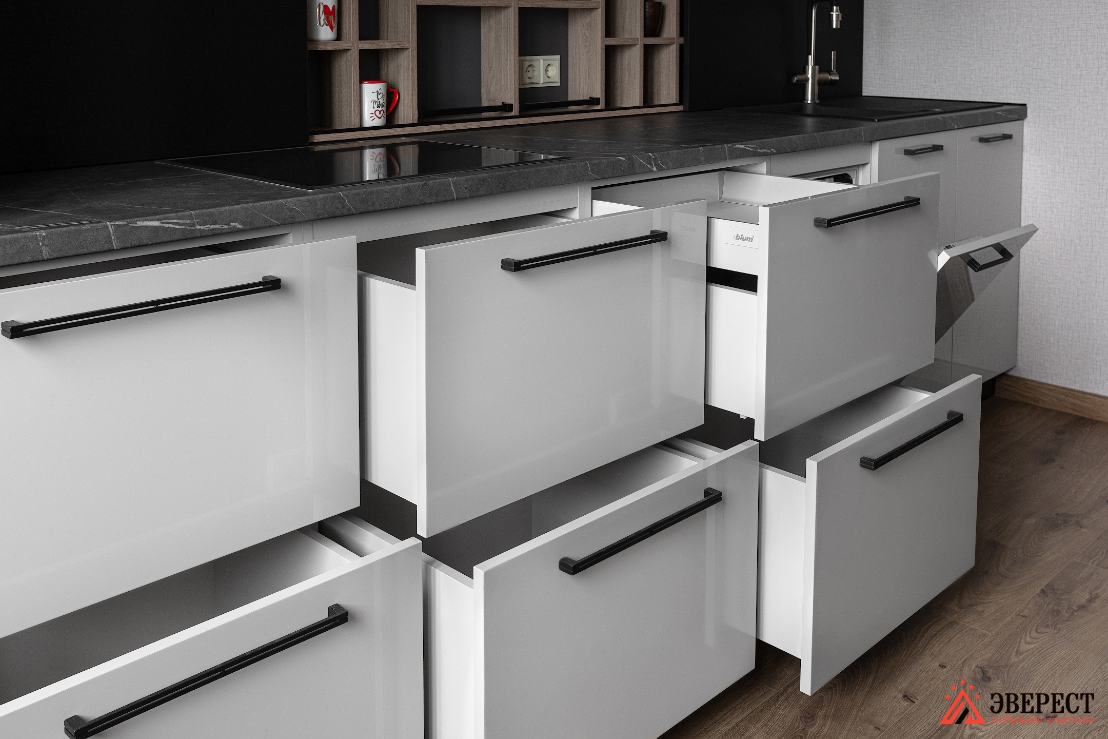 код 123697Фасады: акрил. Корпус: ЛДСП Egger. Фурнитура: BLUM с доводчиками. Столешница: постформинг.