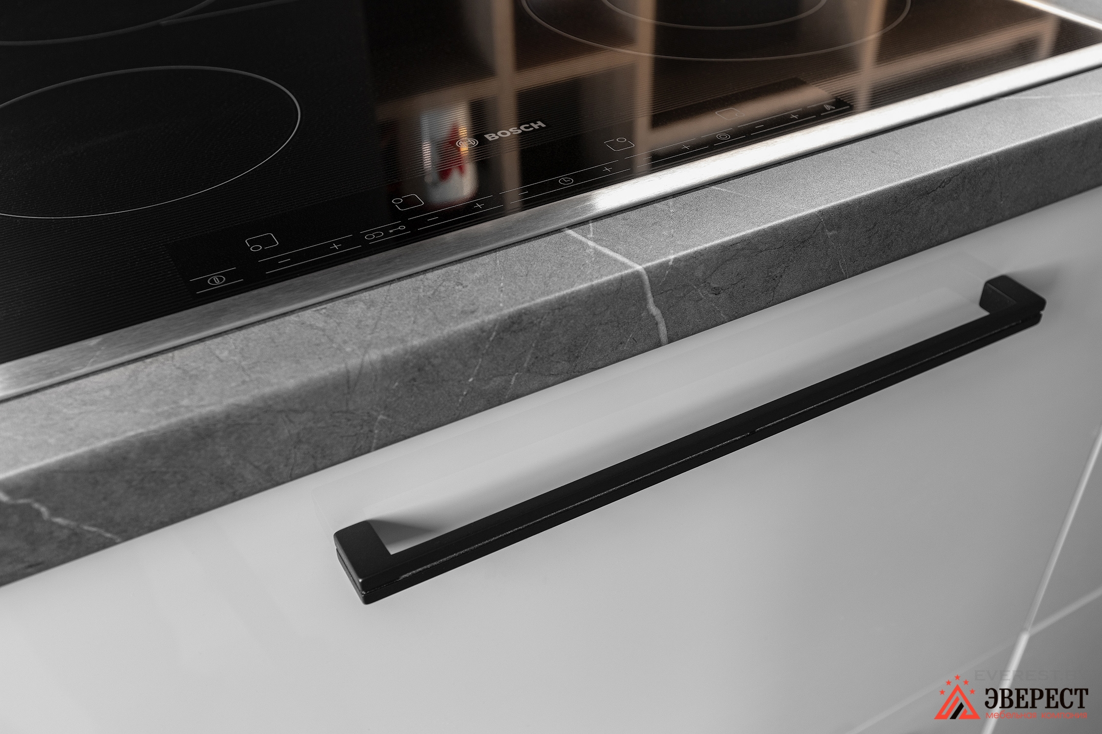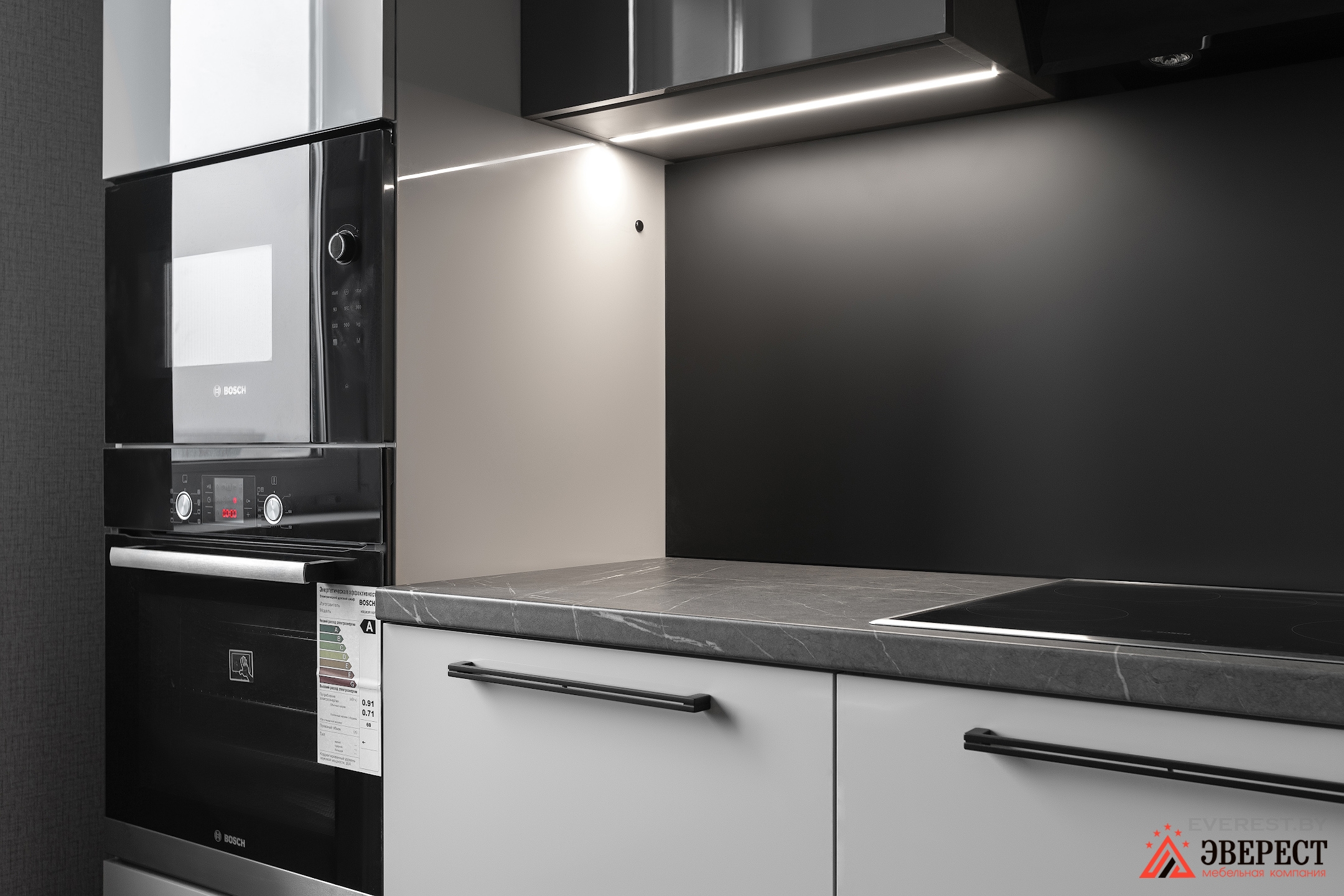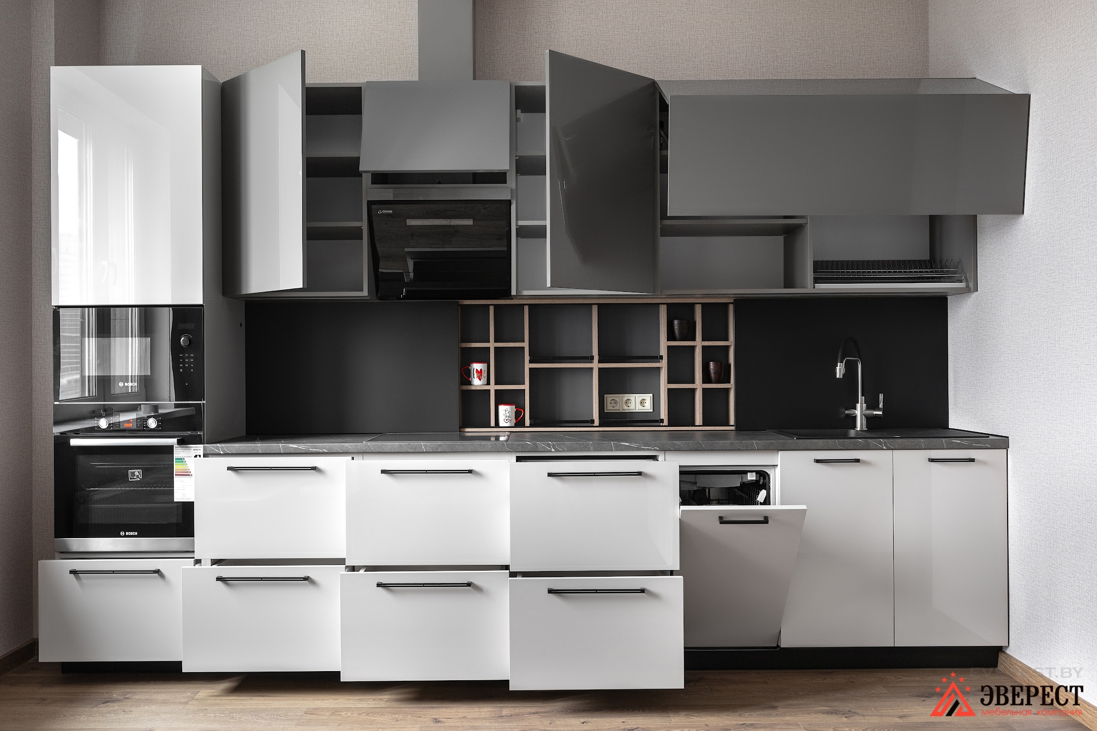 код 123697Фасады: акрил. Корпус: ЛДСП Egger. Фурнитура: BLUM с доводчиками. Столешница: постформинг.
