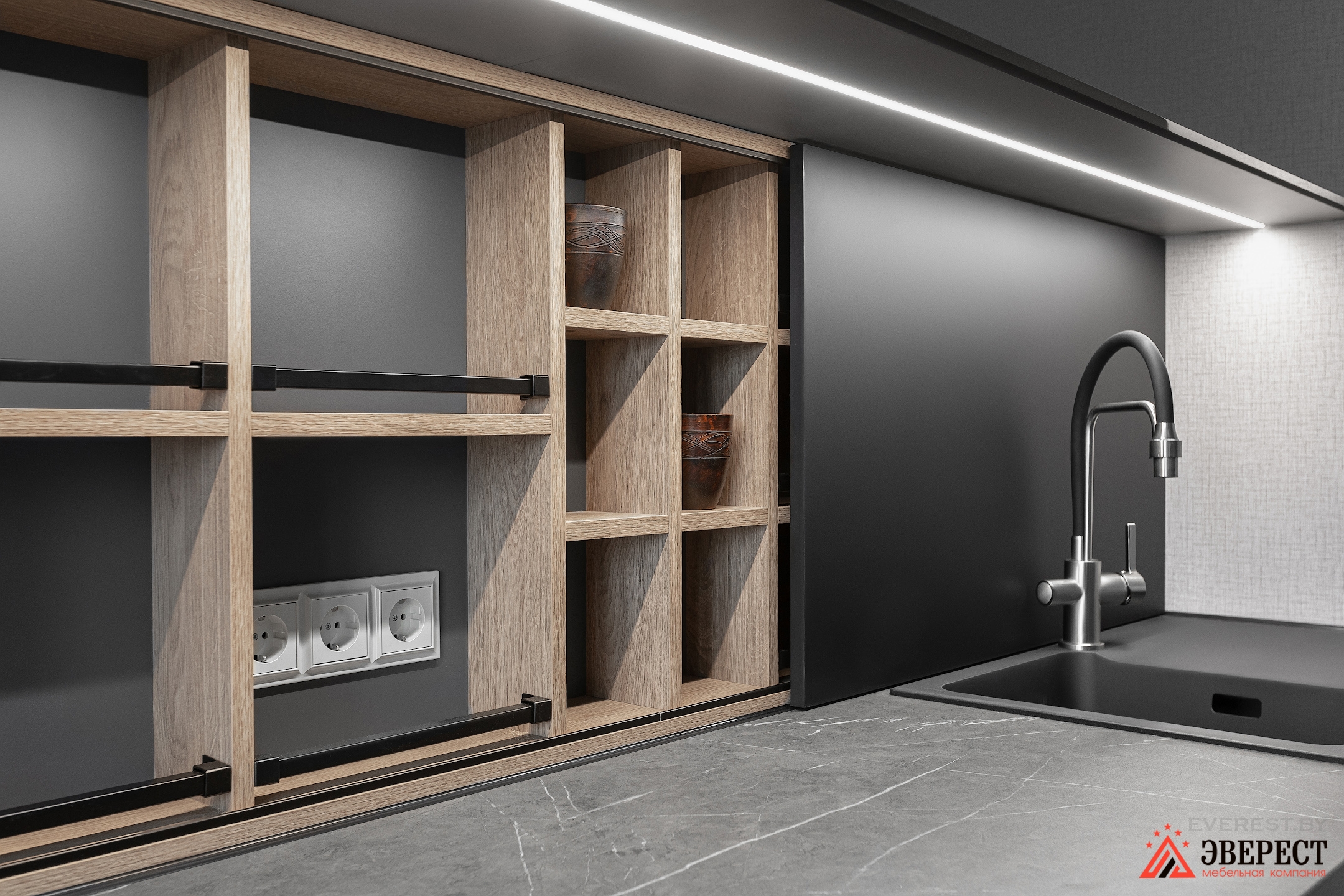 Вместительные фасады без ручек, столешница и фартук с текстурой дерева.